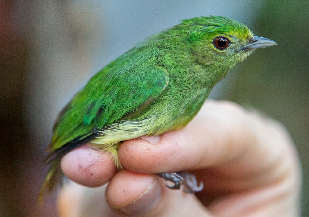 Best of all, even visitors have the unique opportunity to partake in the activities of researchers. There are many opportunities to engage with the staff, and it is clearly part of their training to be friendly and engage visitors in their activities. During my visit, I not only experienced the usual naturalist visitor activities with an expert guide, but I also went on a mist netting outing with Chris (Head of Research) and several volunteers. I learned about the fascinating methodology to catch and document species of the forest understory, such as the male band-tailed and the female blue-crowed manakins. I even had the chance to hold the tiny birds, and then set them free!
