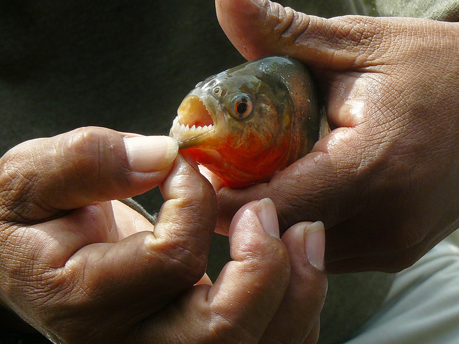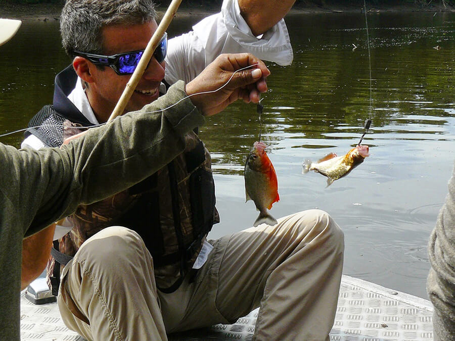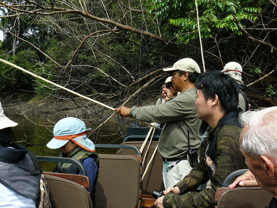 We had an early start the next day with a buffet breakfast served at 7:00am before our morning fishing excursion. We split up into two groups to go in skiffs to a point where we could fish. On our way, we spotted some birds along the shore and even saw some of the bottle-nose dolphins that populate the waters of the Amazon. We did catch and release fishing, and on our skiff, we caught a few piranhas. Unfortunately, while one of the guides was not looking, one of the women tried to throw back what she thought was a regular fish only to discover that it was a tiny piranha that bit her wrist on its way out! Luckily, she was just fine, and the onboard paramedic took care of her immediately.
