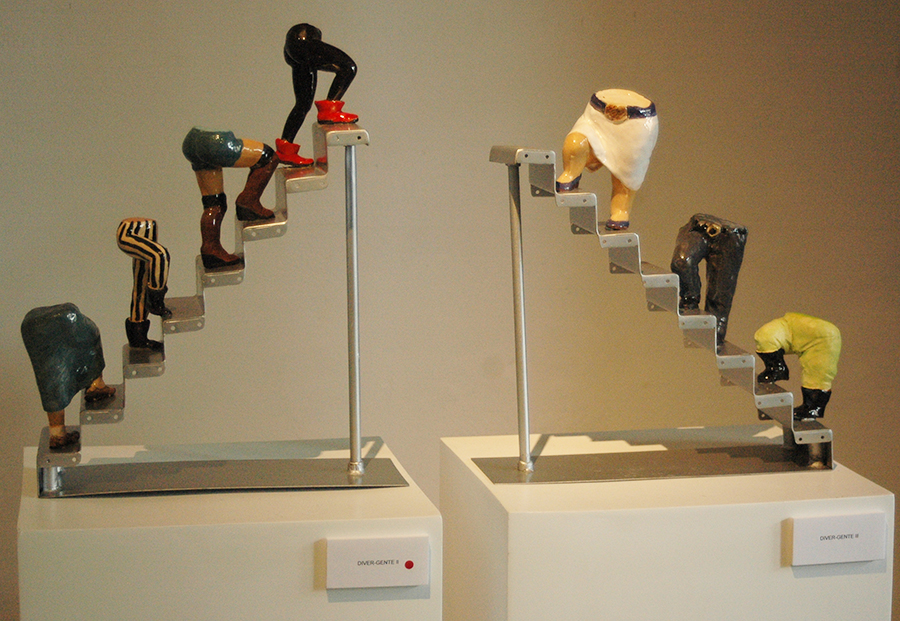 This prosperity, the idea of “the up and up” is the inspiration behind the stairs pieces she created for the exposition—everything is going up, the middle class is booming in Peru, and across the country there is general prosperity across ethnicities and economic class. Hence the name “Divergente”, which would indicate in English, ‘diverse people.’ Puchi explained that her life experience is with clay, but the pieces with the stairs proved a challenge. In the end, she had to make it three times to get it right. However, the work was worth the trouble as the pieces turned out perfectly, and one even sold the night of the inauguration.