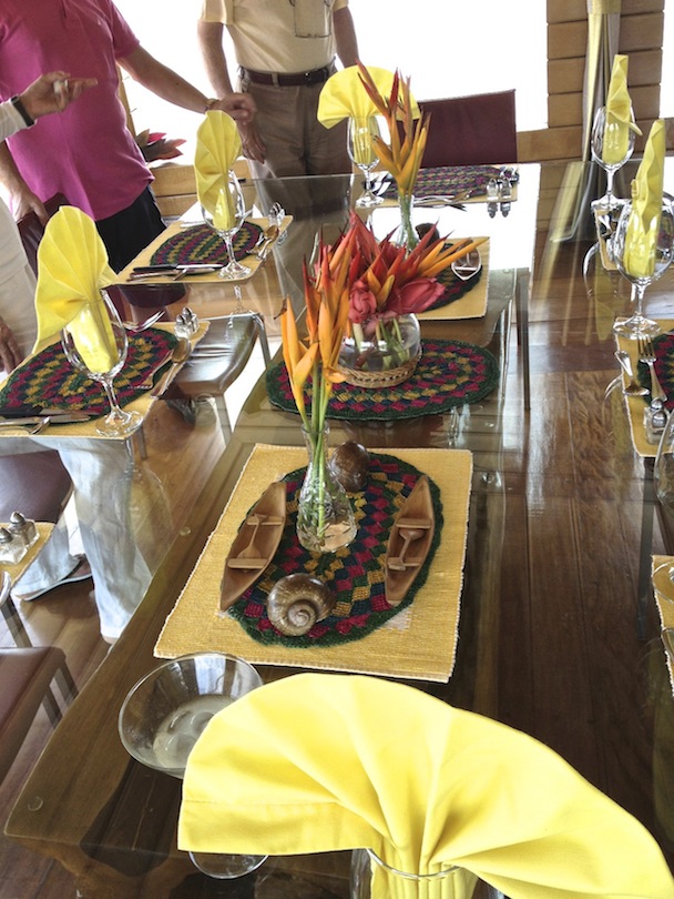 One of the features of the Delfin Amazon Cruises boats is the detail that goes into every part aspect of the décor, with the purpose of bringing the Amazonian spirit and landscape into the traveller’s experience. The food content, the presentation, the decor of the dining room, upper deck lounge, bar and suites are all envisaged to allow you and to encourage you to engage with the Amazon environment. It is important to note that the lounge and bar on the upper deck is open (i.e. not air conditioned). This is something unique to these boats and makes the experience much more authentic. Another feature is the decor of the dining room and place settings. Every meal has a different decoration and layout: not only the table but even chairs and curtains are changed so that they match the colour coordination of the occasion. The result is not only beautiful to look at, but a conversation piece among travellers all of who sit around the same table.