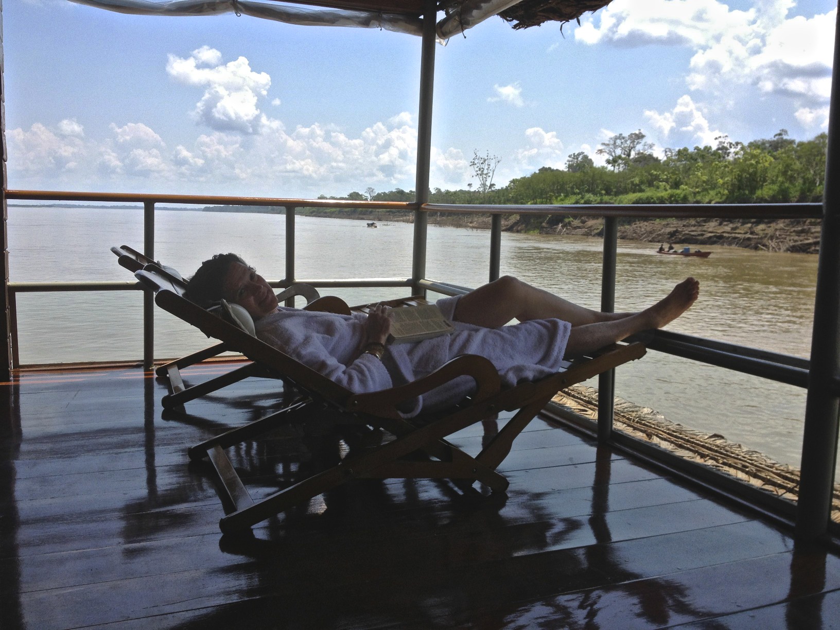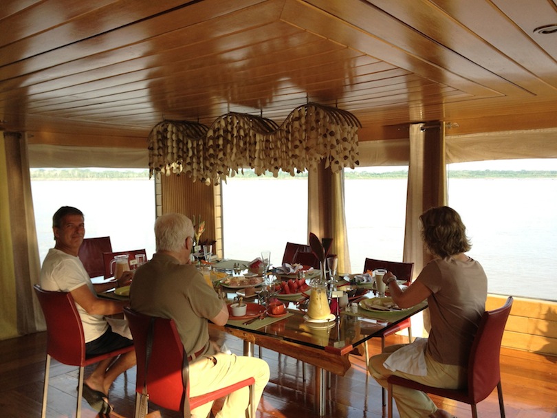 The best feature of the suites is that they boast their own private deck with lounge chairs, as well as a separate table and chair set. It is wonderful to lie down and read in complete comfort and watch the rainforest landscape go by as the boat cruises gently up or down the river. It is hard to imagine that one can be so safe, comfortable and bug-free in this very remote and difficult environment. After settling into our cabins and a short briefing by our guide, we had a delicious dinner in the lovely dining room and retired to bed.