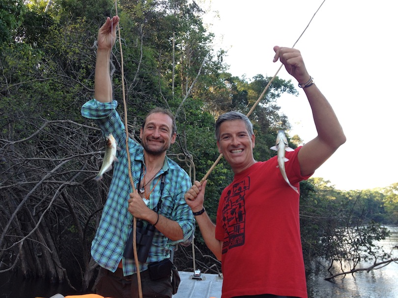The afternoon was spent fishing on the Choroyaku River, a seldom-visited river and where the local community controls entrance. We didn’t catch any piranhas as we had expected but had a great time and captured about a dozen sardine-like fish called corvina. As we slowly cruised on our skiff, we were escorted by at least half a dozen pink river dolphins. It was a wonderful spectacle. We saw two Monk Saki monkeys perched on a high branch, dozens of greater and snowy egrets as well as a variety of herons flying overhead. We spotted an opossum, an Amazonian marsupial by the riverbank. An amazing sight was a slate coloured hawk, which had just caught a frog and was grabbing it with its claws. Then to our great surprise, as the evening was setting in, dozens of fish like the ones we had fished started jumping from the water, and many of them landed in our skiff and others even hit our heads! It was a unique experience to say the least. We returned to the boat in the dark, taking our time to look for caiman, although we only saw a couple for a brief moment. It was a magical afternoon, just as the rest of the experience had been. On arrival on the boat, we started cruising downriver on the Marañón until we reached the Amazon River proper approximately 3 hours later.