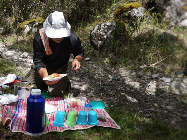 The next morning we were woken at dawn by Epi with a hot cup of coca tea. The serenity and beauty of the lake at dawn, with mist on the water and the moon still in the sky was another highlight of the trip. We didn’t have long to sit around and enjoy the view though – following a hearty breakfast we set out for the remaining hike to Laguna 69.