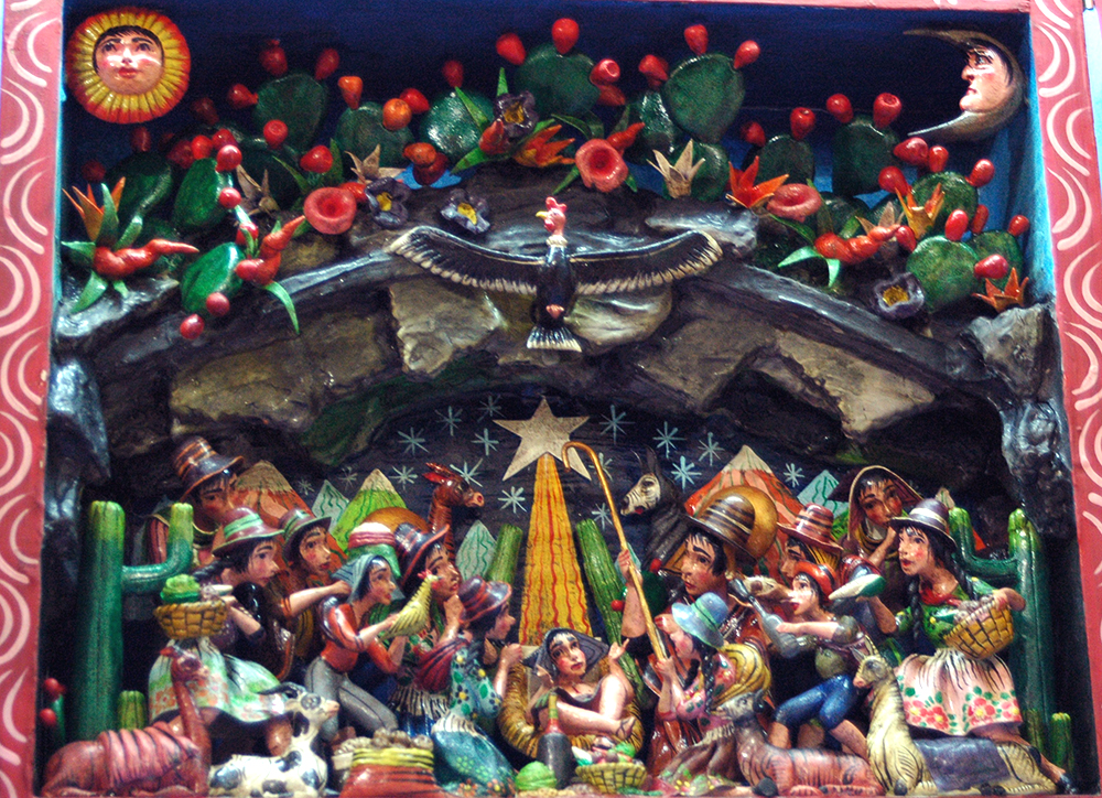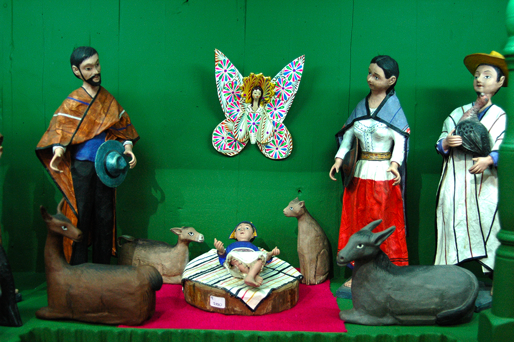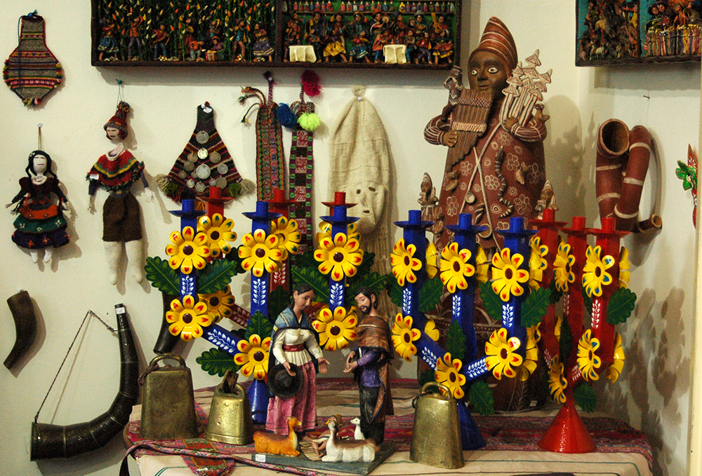 Shop owner Mari Solari has an eye for folk art and decades of experience seeking out and extracting quality artisanal works from a myriad of Peruvian cultures. In keeping with the Las Pallas tradition, she has transformed what is usually her living room into a public Christmas exhibit, featuring an ornamented cactus as well as a mountain of nativity scenes and colorful crafts in honor of the “Apus” (mountain deities) of Peru. Everything on the ‘Christmas Cactus’ and mountain display is for sale, except for the cactus itself, which will return to Mari’s personal garden at the end of the season. The decorations are a mix of carved, hand painted angels, woven pieces like llamas and wooden ornaments of little animals of Peru like the famous cuy (or guinea pigs).