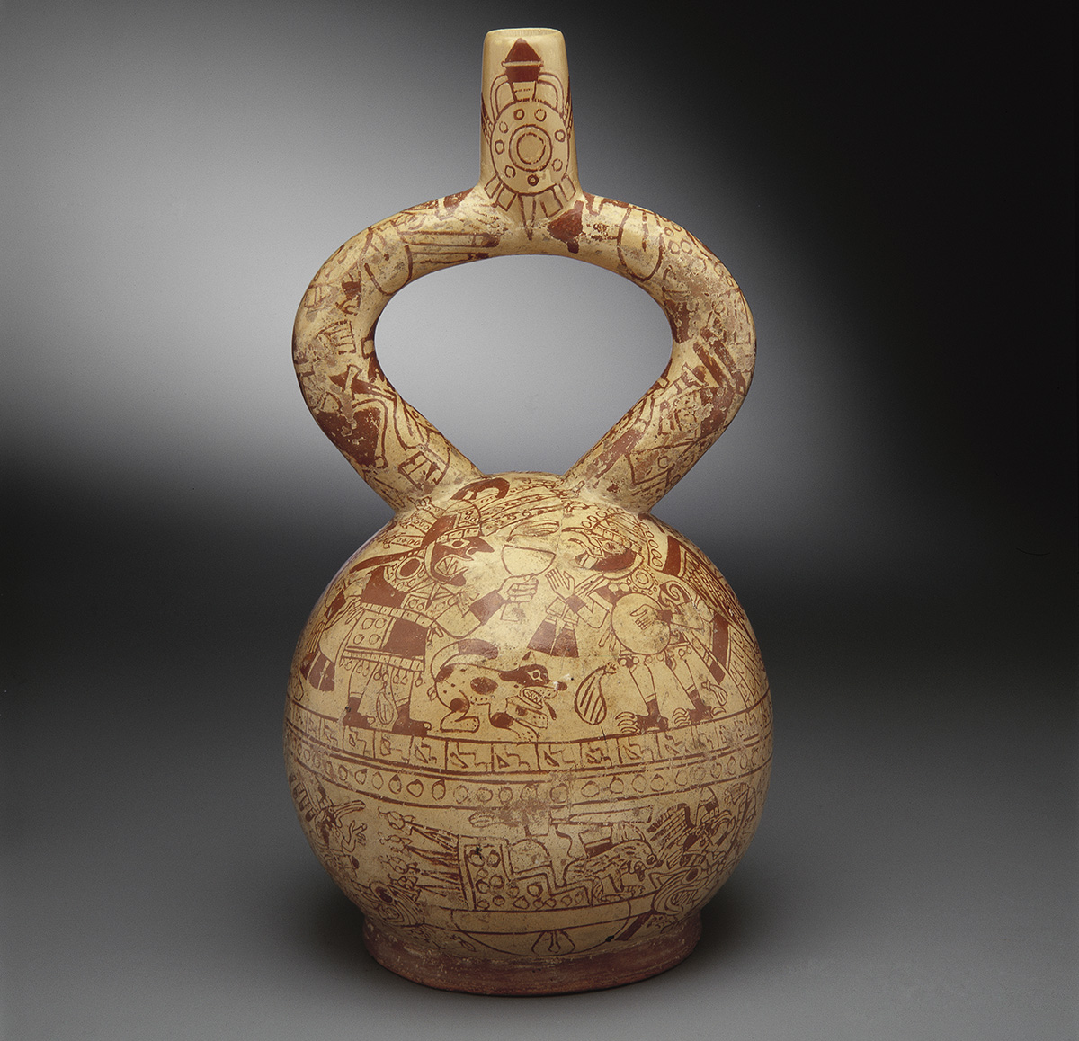 Although the extensive Larco Museum catalogue spans thousands of years of civilisation across Peru, Moche art dominates in the capital’s museum – ceramics in particular – and so this is the key focal point of the exhibition. The ample, well-preserved Moche ceramics available to archaeologists and art historians gives the opportunity to contrast and compare different styles, assess how designs have developed over time and how they have been transmitted between different regions. Through detailed investigation, it is possible to observe how Moche society formed its beliefs and assimilated aspects of cultures from other parts of Peru.