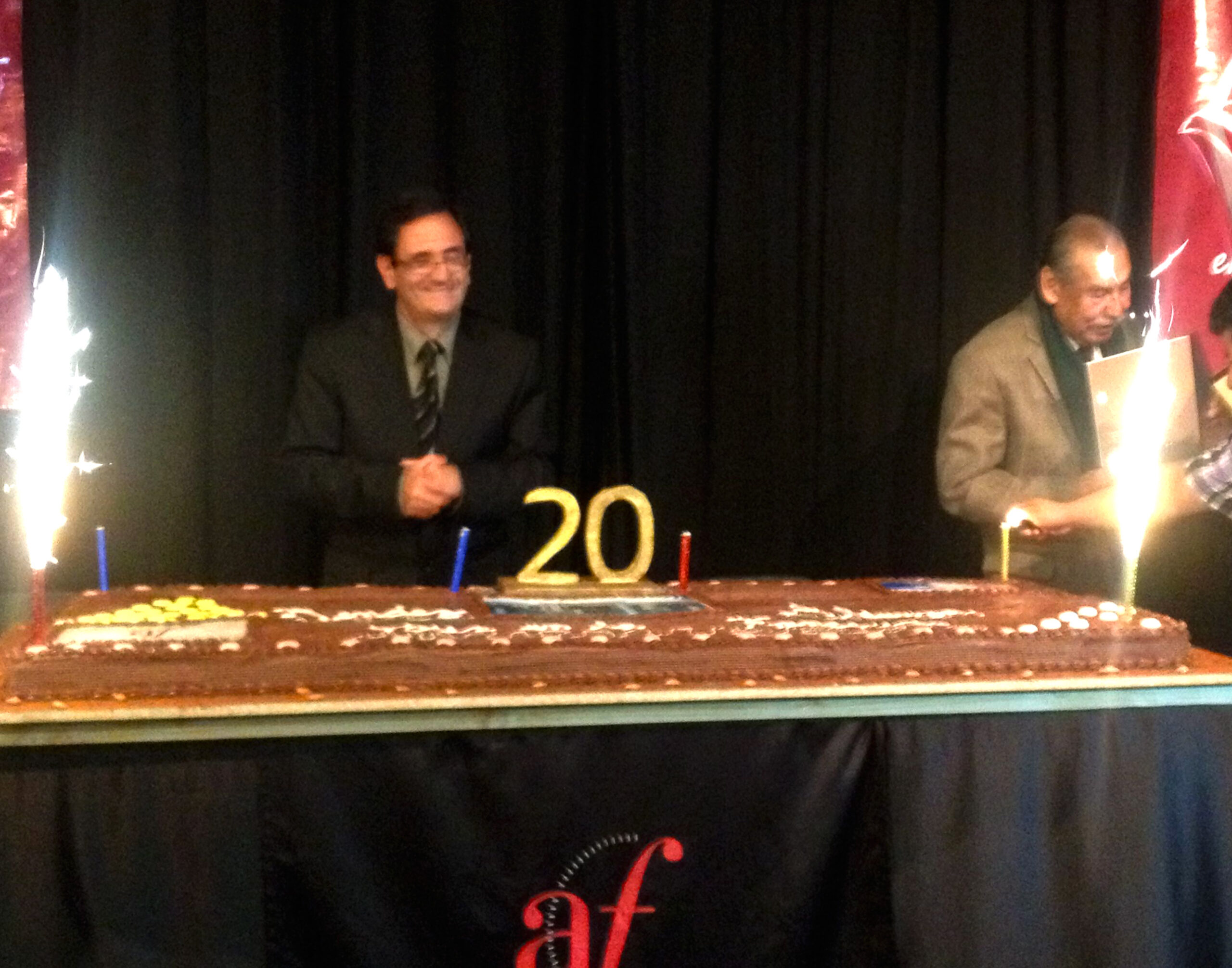 When the conference ended, Paul Elie Levy announced another surprise that arrived in the form of a giant cake to celebrate the 20th conference at the Alianza Francesa. As if the attendees (Giovanna, Vicky and I included) weren’t already hungry enough after hearing about the delicious culinary combinations described, but we were in luck because the conference was followed by a reception with cheeses, breads, wine and of course, chocolate cake.