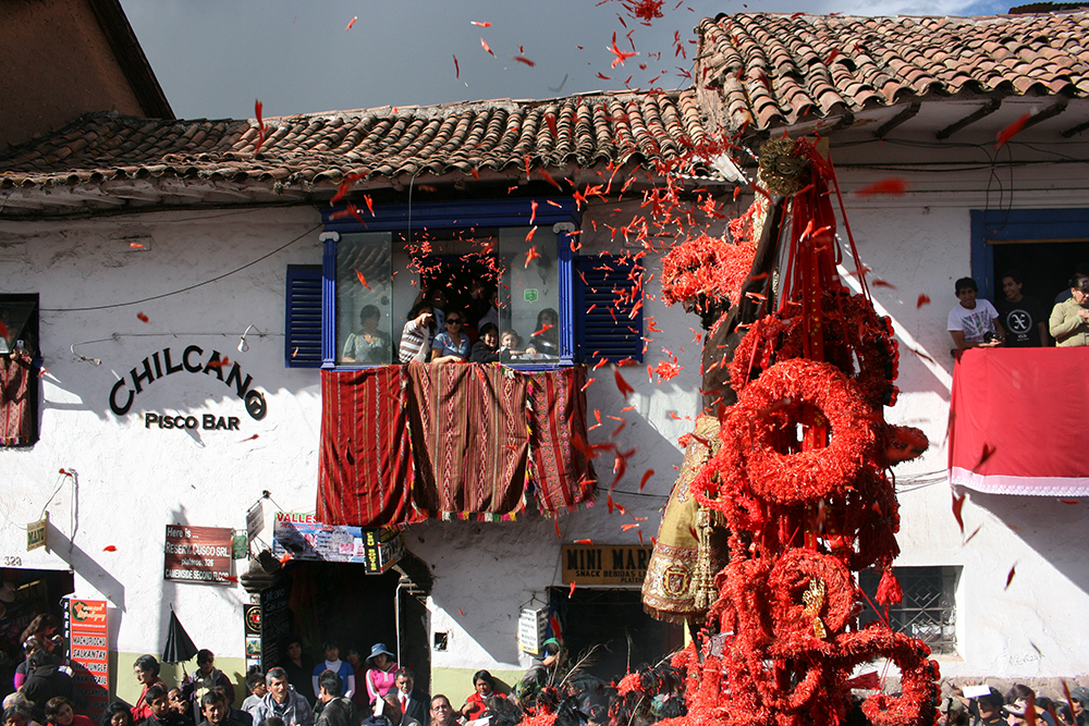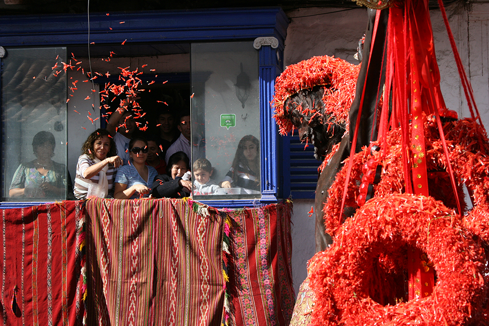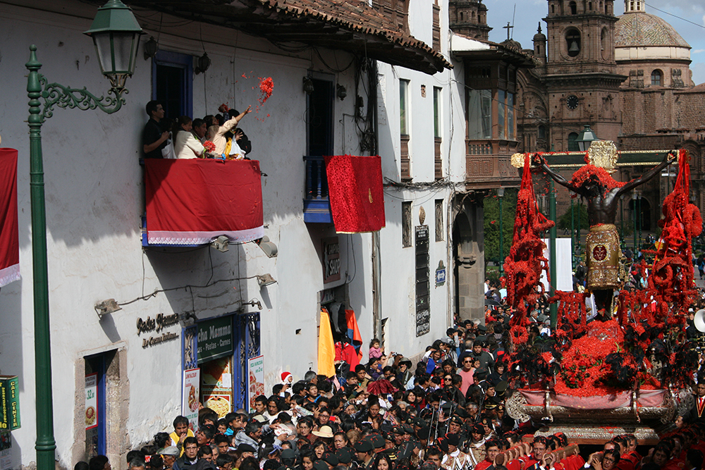 On the day of the procession, two groups of Quechua singers known as chaynas or jilgueros inaugurate the ceremony with song as the statue prepares to move from the cathedral. Other senses are awakened with the rich colour of the crimson ñukchu flower which decorates the cross, symbolising the blood of Christ. Finally, flanked by the singers and crowds of people, the procession starts its winding journey through the streets of Cuzco to the Plaza de Armas, just as it did for the first time in the 17th century.
