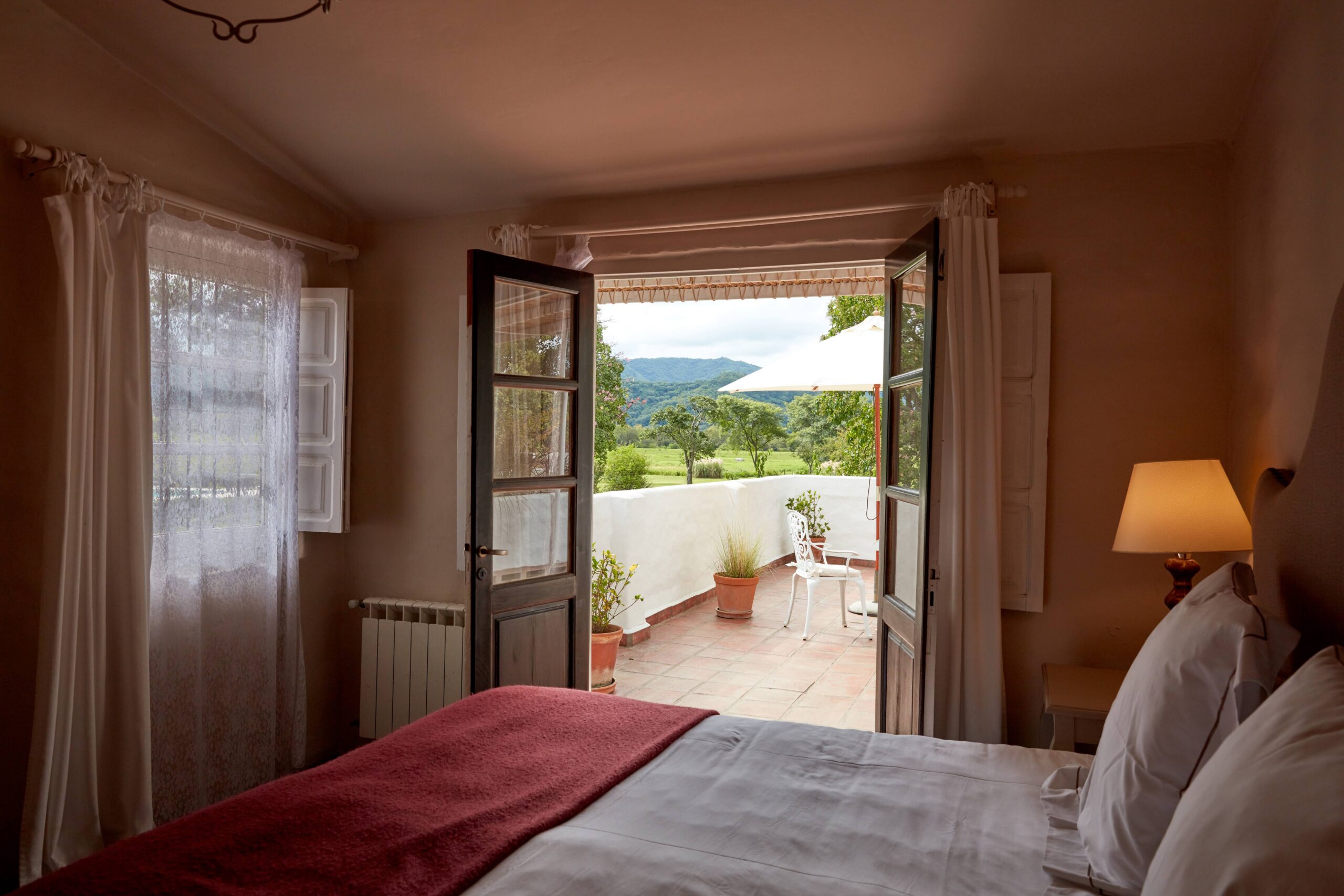There are 3 Suites situated in a charming house just metres from the main residence, their typical northern Argentinean rural chic style Suites are decorated with refinement and elegance. The soft beige and ivory colours contrast with the force of the brown earth tones. The 40 sq. m Suite has an independent entrance, featuring a separate living room and opens on to a private terrace with a view of the Andes. The very bright large bath comes with a bathtub, a separate shower and two sinks. The suites have: satellite TV with international channels, free Wi-Fi, air conditioning and heating and safe.