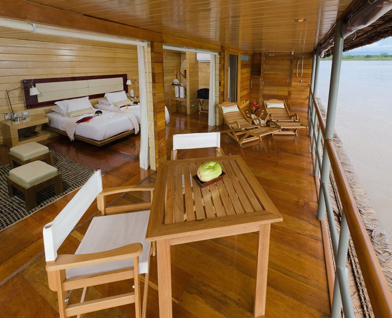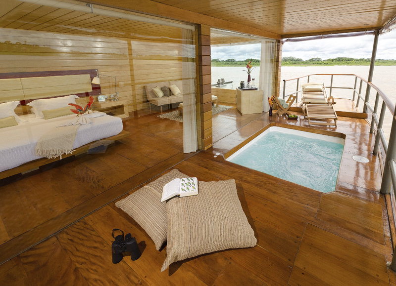 There are two room categories on board the Delfin II: Suite and Master Suite. All suits have over-sized windows for fantastic views of the jungle scenery. There are four Master Suites and 10 Suites. All cabins include premium touches like all-natural bath amenities, binoculars and yoga mats.