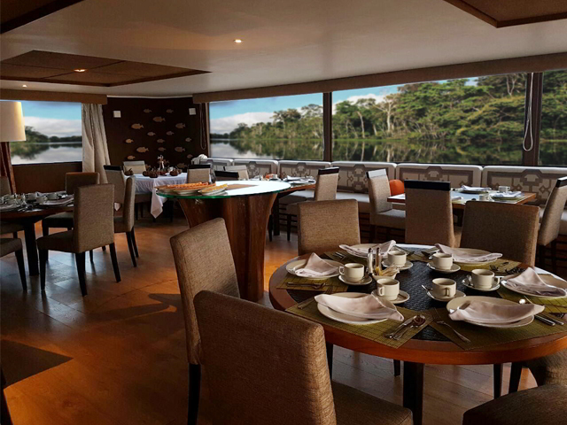 By virtue of being the largest vessel in the Delfin fleet – though still an intimate size compared to the largest cruise vessels operating in the Amazon – it has extra space that allows for additional facilities including an outdoor top deck lounge and plunge pool, fitness room, spa and boutique.