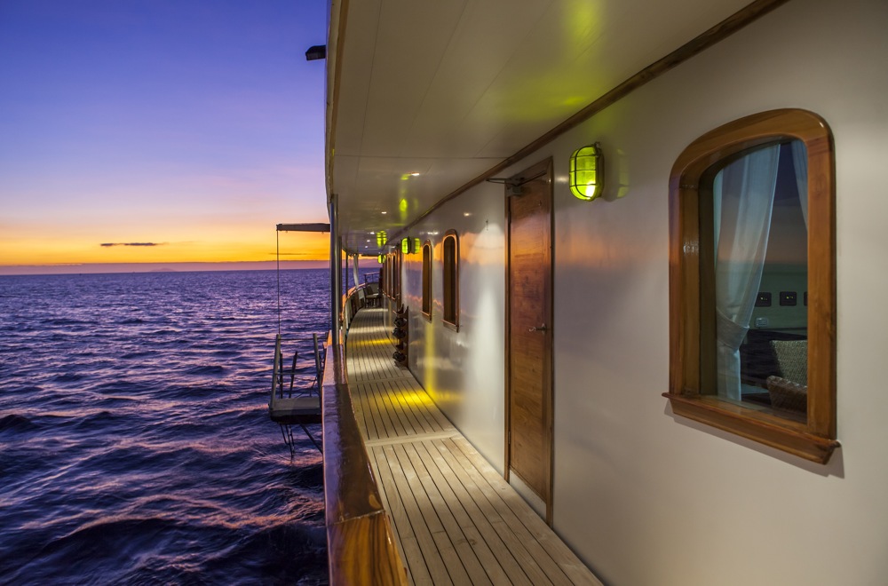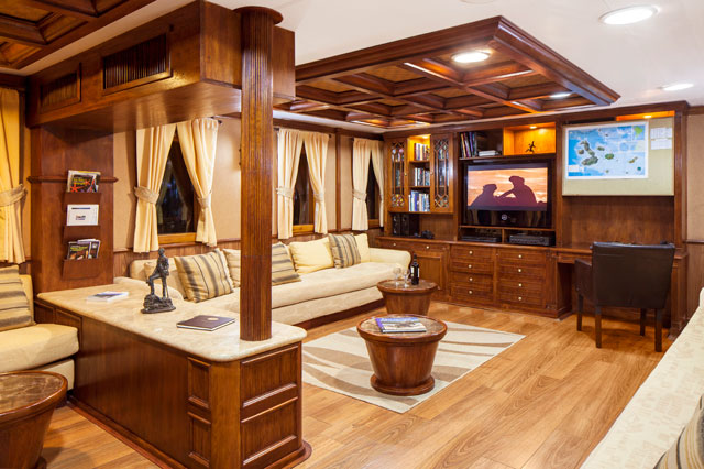 There are three levels on which to relax outdoors or inside. The main deck has a TV and lounge area, library with a wide array of books, a bar and stereo system. The sun deck has a jacuzzi to slip into at the end of the day or after snorkeling and ample seating to soak up the sunshine. At sunset, happy hour is a highlight atop the sky lounge bar. Guests can use the sea kayaks, snorkeling gear and wet-suits during excursions. There is a small shop.