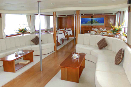 Rooms are outfitted with a stocked mini-fridge, an entertainment center with an LCD monitor that doubles as a music center, where you can review videos, pictures or watch a DVD from the yacht’s library. The en-suite bathrooms have a full-sized shower and storage cabinet.